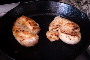 Heat a cast-iron pan over high heat. Add some olive oil and cook the chicken breast and sear it until you get a brown crust on both sides. Remove from the pan.