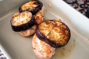 In an oven tray, place the chicken breast, cover each breast with 1 slice of prosciutto, 1 or 2 eggplant rounds, tomato sauce, and fresh mozzarella sliced.